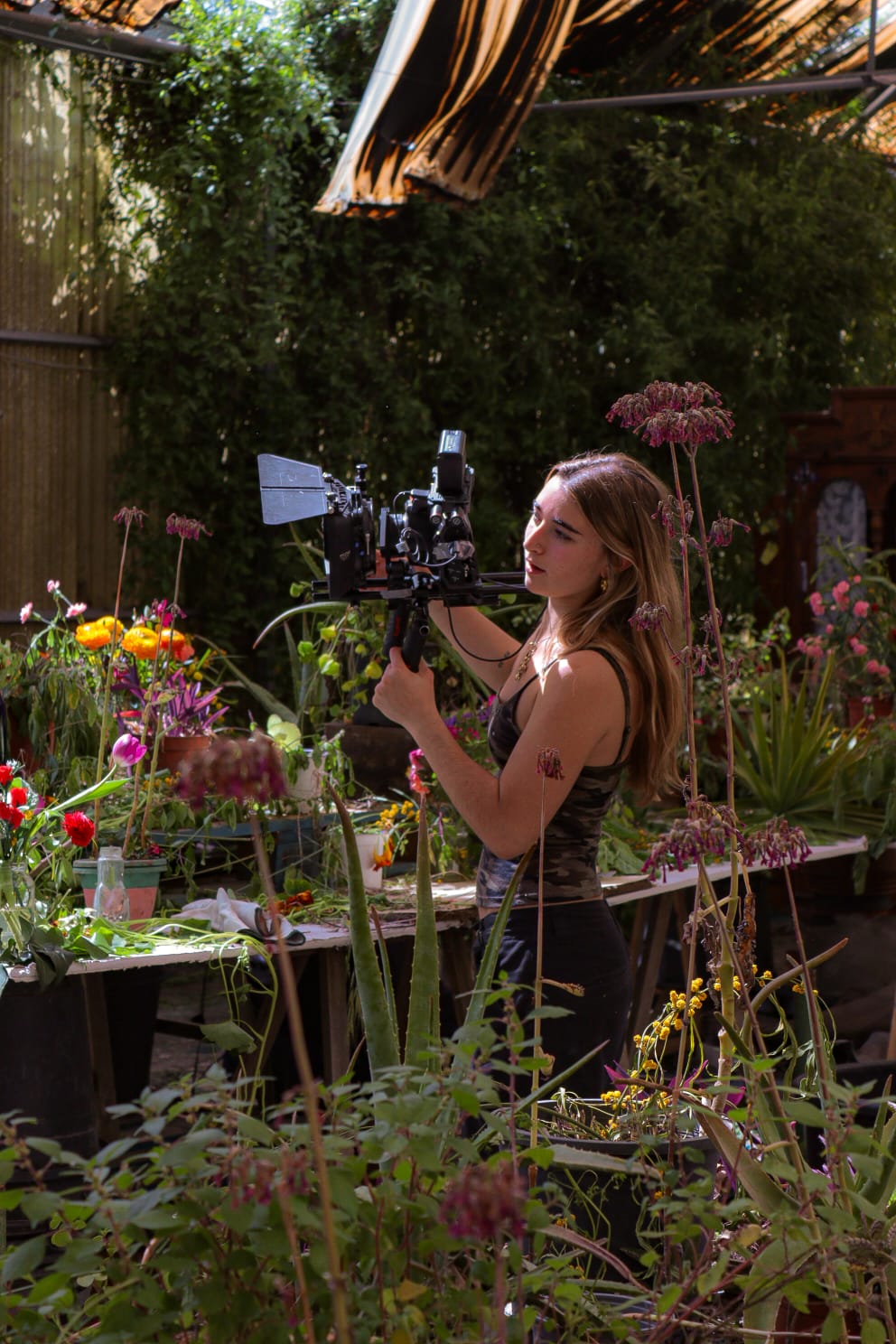 Després venia elles dues, quan la relació i la conversa començava a florir. L’espai es va obrir, les òptiques es van fer més amples, i la llum de tarda, suau i filtrada, ens ajudava a crear un ambient de complicitat. Va ser en aquest moment que vam presentar per primera vegada el confessionari en el món real, amb una posada en escena que començava a connectar subtilment amb la seva versió onírica.