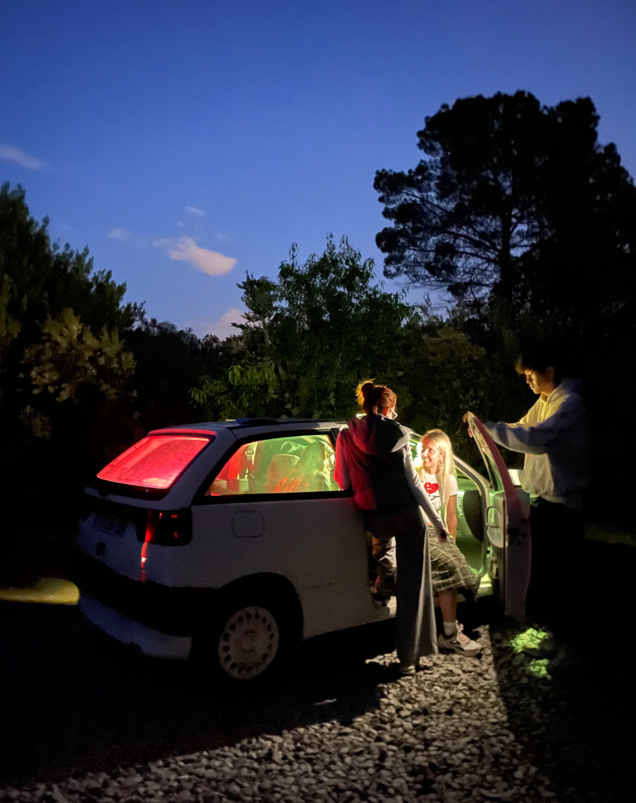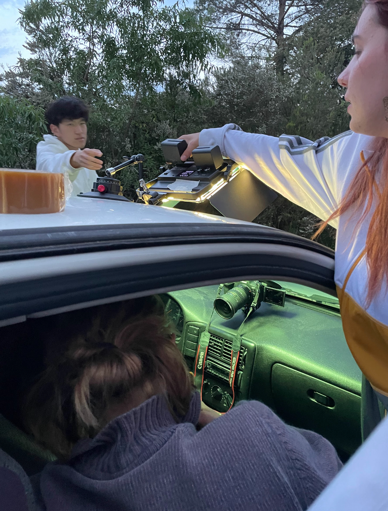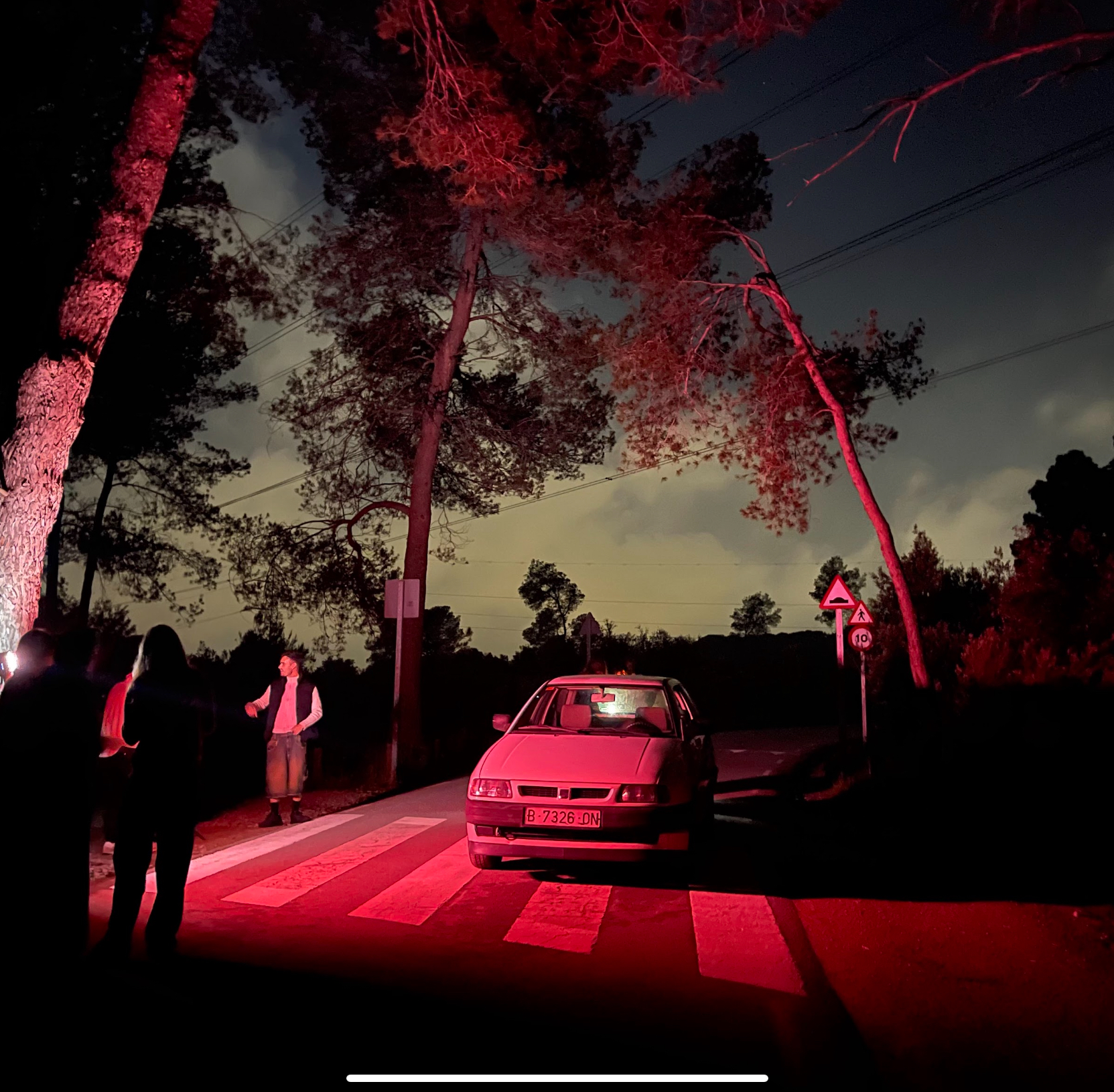 I per la llum de nit, vam voler falsejar la llum del cotxe com a font principal, gripejant un panel led amb una altre lapa que teníem a dalt del cotxe per tenir exposició i posant un altre panel led al maleter per simular la llum dels frens del cotxe.